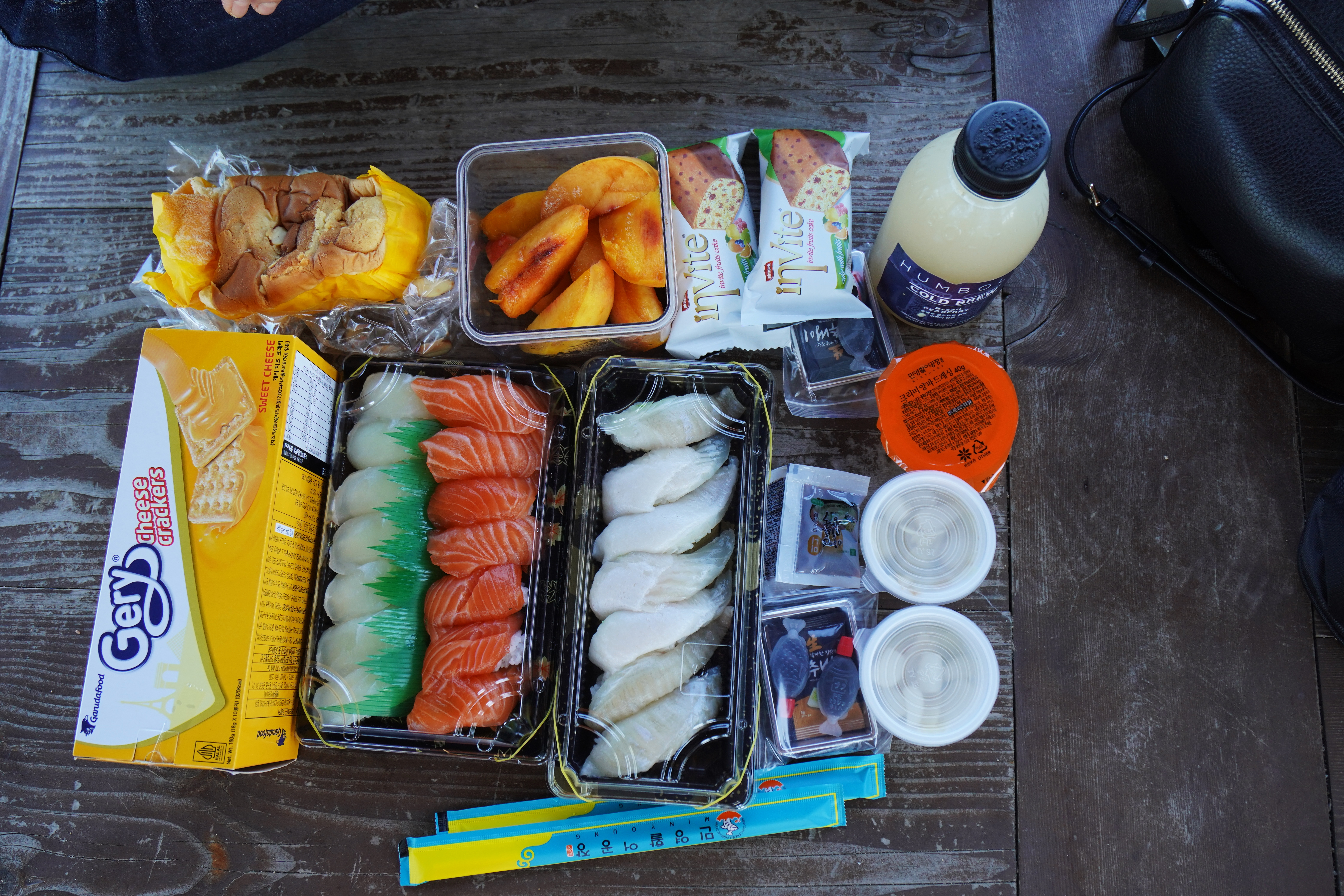 오늘은 점심으로 먹을 초밥을 사 들고 어시장을 빠져나갑니다.